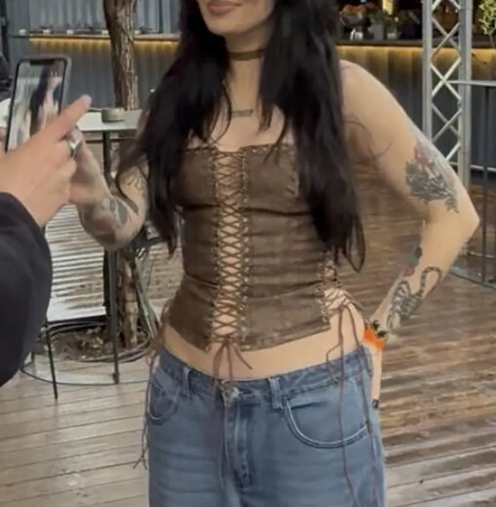 Faux washed leather longline halter corset with eyelet and lace up details.