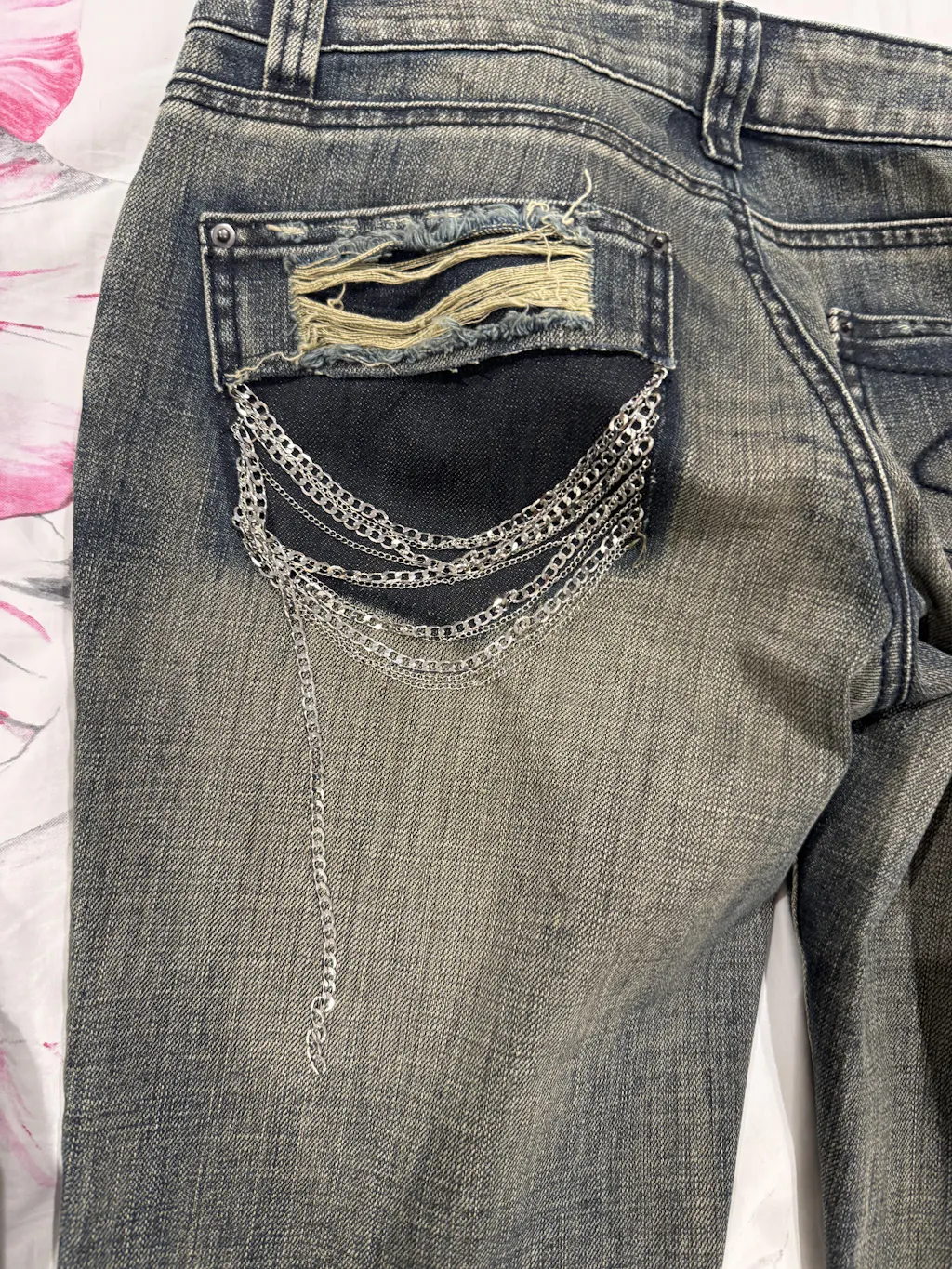 These low-rise bootcut jeans are made from non-stretch denim in a vintage rusted blue wash, combining bold detailing with a structured fit. Featuring 3D rivet and dome stud artworks at the knees and waistband, distressed rips with hanging chains, and decorative embroidery on the back pocket, they bring edgy, statement styling. Finished with antique silver metal hardware.
