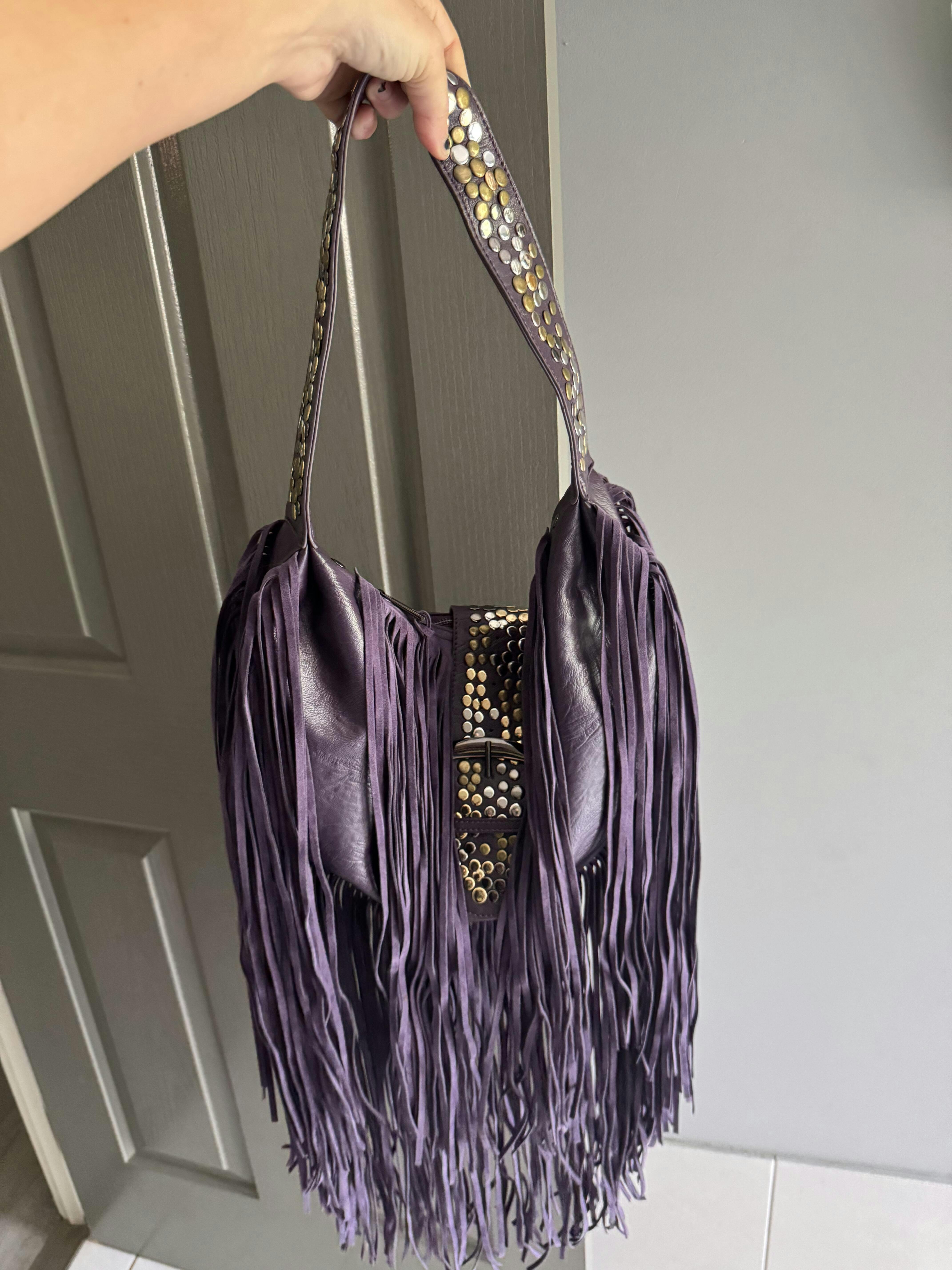 Purple PU leather slouchy bag with faux suede fringing and assorted studding details