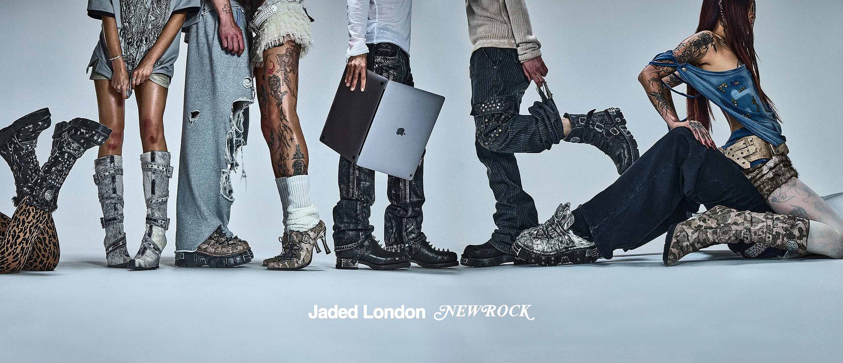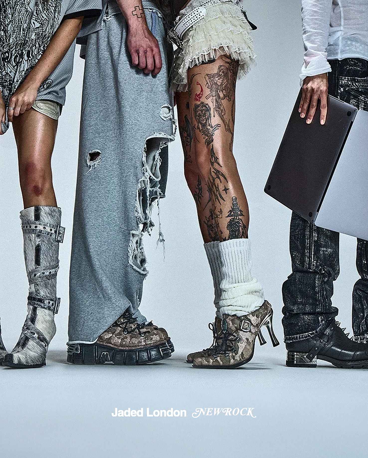 Introducing our second collaboration with New Rock. Capturing the zeitgeist of sleaze and punk, this 9-piece capsule includes New Rock’s classic styles, each pair handcrafted in Spain. The shoes feature real cow hide so no two pairs are the same as well as cracked camo, distressed leather uppers and barbwire dubraés, completed with antique branding.